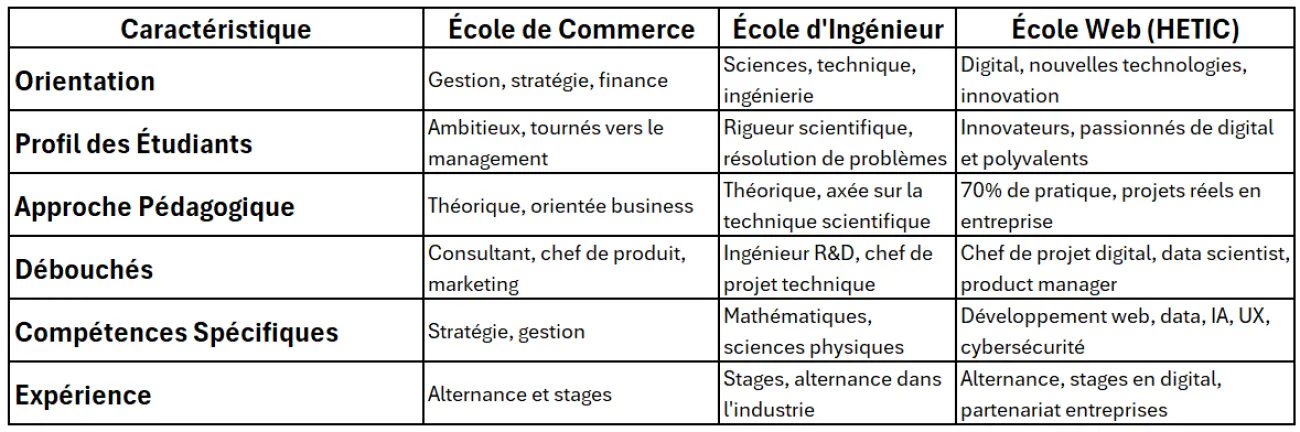 Dans un monde où le numérique transforme chaque secteur, il est essentiel de choisir une formation qui correspond à vos aspirations et compétences. École de commerce, école d'ingénieur ou école web ? Chacune attire des profils distincts et offre des perspectives uniques. Dans cet article, nous comparons ces parcours en insistant sur les différences de vision et d’approche pédagogique, et comment le Programme Grande École (PGE) d’HETIC se distingue par son exigence et son immersion dans les métiers du digital.